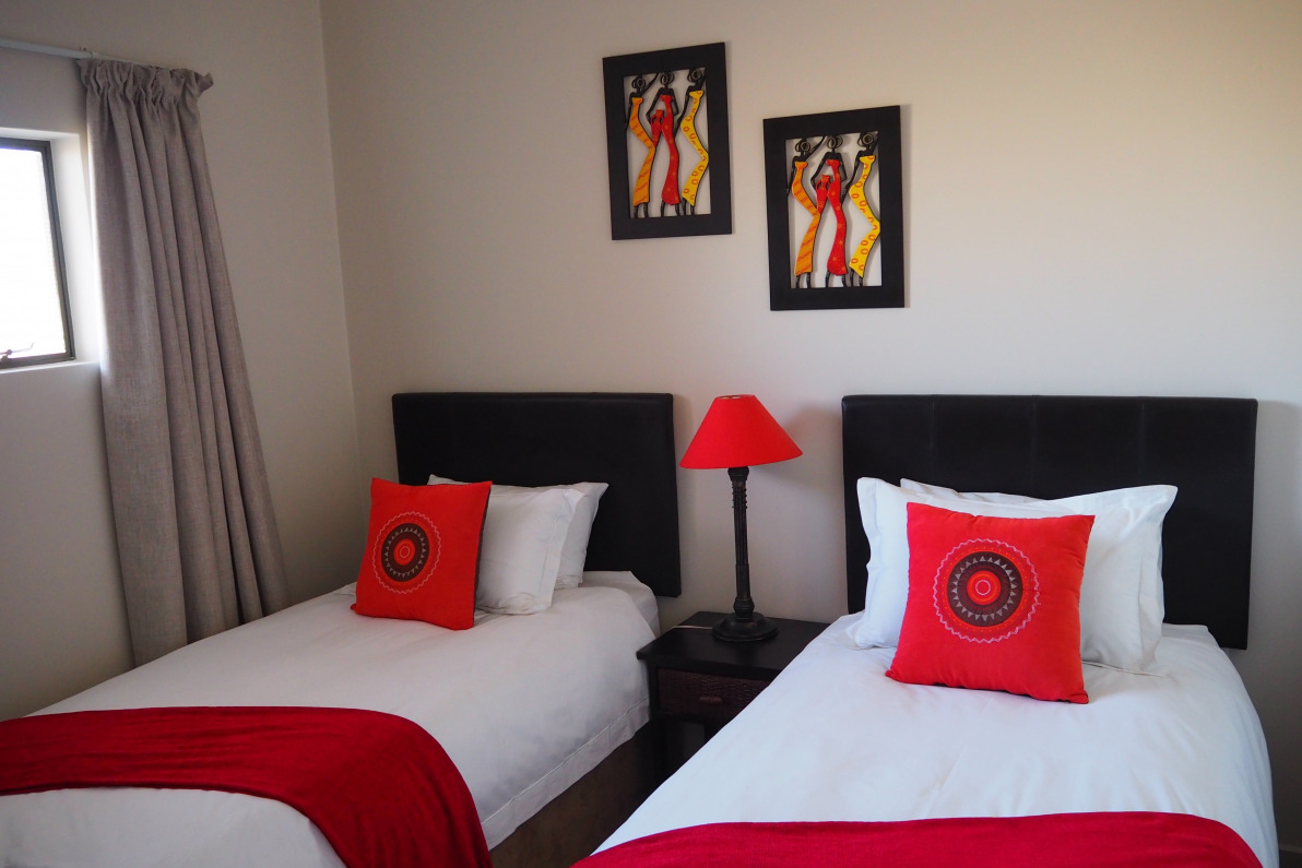 The units are situated in a secure, gated complex with 24-hour security guard on duty. Covered, secure parking is allocated to each unit. We offer apartments with 1 bedroom and 1 on-suite bathroom. These units are 65m². Our other apartments are a roomy 80m² and feature 2 bedrooms and 2 bathrooms. These units have a queen bed with on-suite bathroom in the main bedroom, while the second bedroom features either 1 or 2 single beds, depending on unit configuration. A separate bathroom with shower serves this bedroom.
